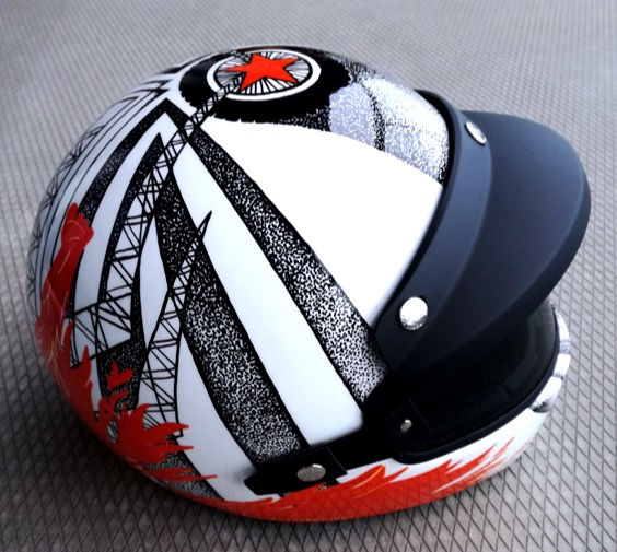 The illustration exists of his personal details like his initials, year of birth, rememberable motor trip through Australia and his favourite motorcycle Triumph Bonnevile. It became a unique piece of protection and he still wears it to show off during gentleman rides through the city. [the first street scene photograph was shot by Hans Zijffers a.k.a. Craftwerk]